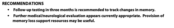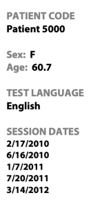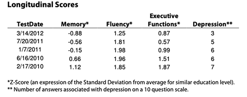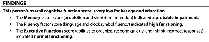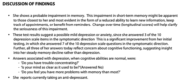 You can open an example of our 2-page report in PDF format. This report is on a woman with reported depression who appeared cognitively unimpaired at her first testing. We recommended that she return in 6 months to track changes in depression. As her memory declined, we continued to recommend testing in 6 months and observed gradual, continued memory decline despite less depression. The report shows that her symbol fluency, usually the last domain to give out with impending Alzheimer’s, remained relatively unimpaired and stable.
