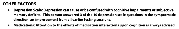Reported contextual dimensions which influence cognitive performance are considered in the physician report. Attention to these can often clarify the likelihood of progressive decline.