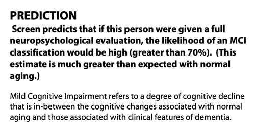 The prediction of the probability that a full neuropsychological evaluation will result in an MCI classification of the person tested is a unique product of CANS-MCI testing and is given with a description of its implications.