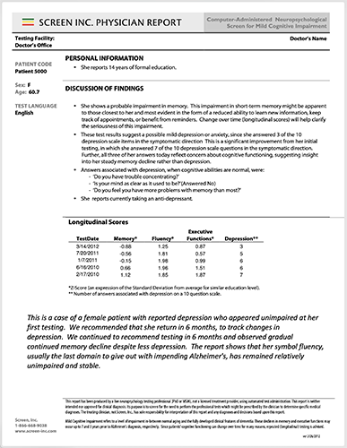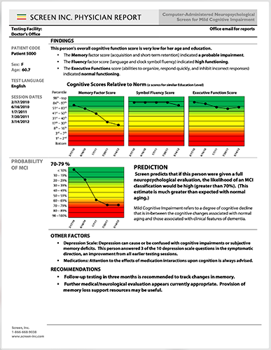 For some patients, Screen’s Report might show that everything looks okay. For others, the doctor might decide that the low test scores should be followed up with a patient meeting, additional testing, or specialty referrals. Sometimes a specific contributing factor such as depression or alcohol use needs to be addressed before testing is repeated.
